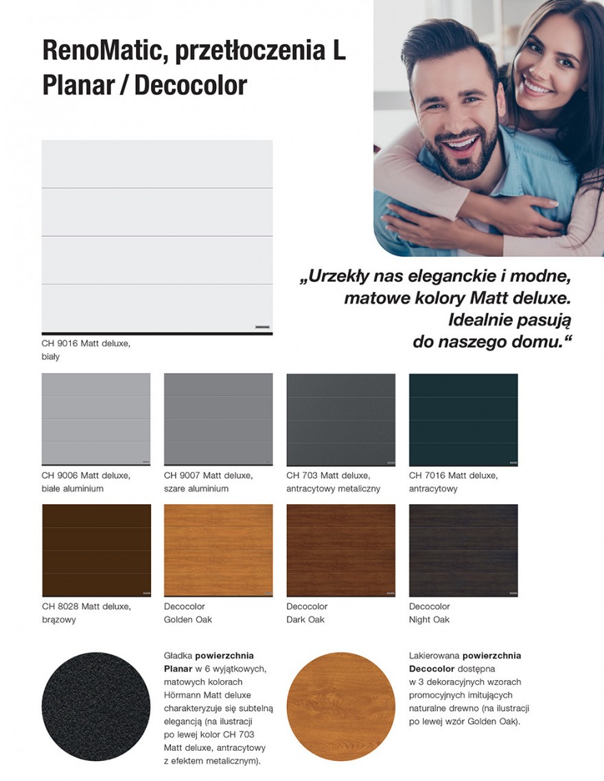 Promocyjna brama garażowa RenoMatic wyjątkowo atrakcyjnie prezentuje się z szerokimi przetłoczeniami L i bardzo elegancką, gładką powierzchnią Planar w kolorach Matt deluxe. To nowość dostępna tylko w firmie Hörmann. Bramy segmentowe o takiej powierzchni sprawiają wizualne wrażenie i wyczuwalny dotykiem efekt niemal idealnie gładkiej, matowej tafli. Powierzchnia Planar oferowana jest w sześciu kolorach Matt deluxe: białym, białego i szarego aluminium, antracytowym i antracytowym z efektem metalicznym oraz brązowym.
